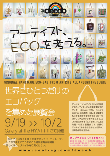 様々な環境問題が取り沙汰される中で、私たちはまず自分たちの身近な ところから、できることから少しずつ、問題の改善のために行動を起こすべきだと考えます。そこで私たちはアートによる環境問題への取り組みの一環として、アーティストによるハンドメイドの、世界に1点だけのオリジナル・エコバッグ「decob」をプロデュースし、世界を巡回する展覧会を開催中です。