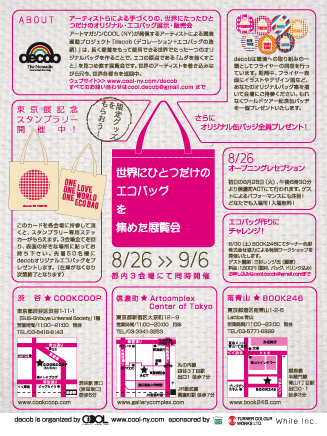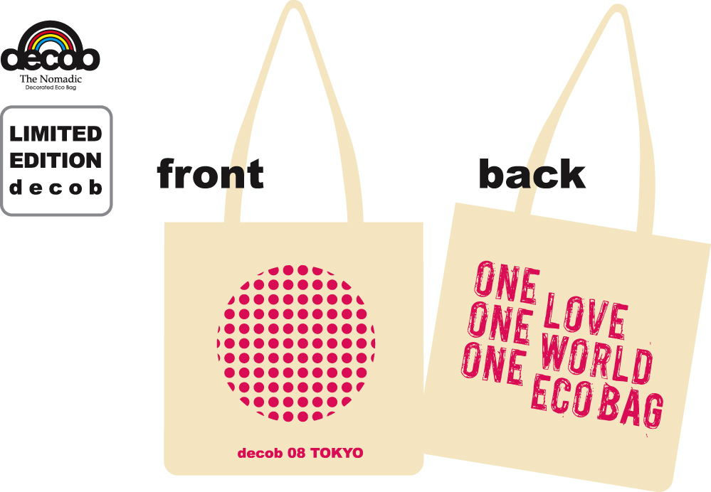 様々な環境問題が取り沙汰される中で、私たちはまず自分たちの身近な ところから、できることから少しずつ、問題の改善のために行動を起こすべきだと考えます。そこで私たちはアートによる環境問題への取り組みの一環として、アーティストによるハンドメイドの、世界に1点だけのオリジナル・エコバッグ「decob」をプロデュースし、世界を巡回する展覧会を開催中です。