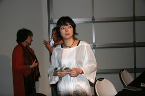 所狭しとギャラリーの入り口に集まる参加者たち。200人ほどの参加者のうち半数近くが西海岸や全米各地から集まった。参加者の中には、ブラジルやドイツ、オーストラリア、日本など、海外からの参加者もいた。そこにアレックス・グレイが登場した。その風貌は華奢で繊細であり、一体どこにあれだけのパワフルな絵を描くエネルギーを秘めているのかと不思議になる。