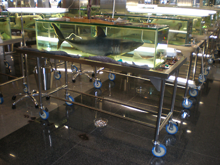 水槽の列の最後尾にはひとつだけサメが入った水槽があり、そこには蛍光灯の代わりに、植木、メスや鉗子などの手術用具が置かれ、その周りには血液を思わせる赤い液体が滴っている。そしてなぜかこのサメの水槽の下に置かれた灰皿にだけは吸い殻が山盛りだった。