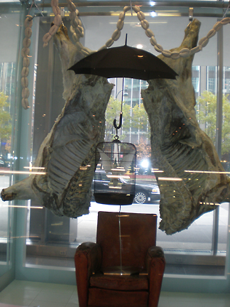 通りに面したガラス付近にはさらに不思議な作品が置かれている。2メートル以上ある巨大な水槽には同様にホルマリンが満たされ、その中には胴体を2枚におろされた巨大な牛、ソーセージ、傘、鳥カゴの中で翼を広げた白い鳩、アンティークのソファが収められている。水槽の左上にはシルクハットが置かれ、右手の縁にはステッキが掛けられている。