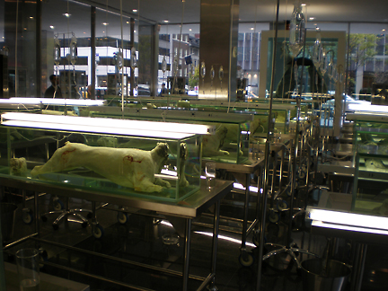 ロビー中央には、ホルマリン漬けにされた30頭の羊がズラリと並ぶ。頭部と胴体を分けられた羊は、それぞれ個別にホルマリンで満たされた水槽に収められ、ストレッチャーの上に置かれている。そこにさらに蛍光灯、吊り下げられた点滴、水の入ったガラスのコップ、砂、空の灰皿やバケツなど、様々な意味あり気な装飾が施されている。