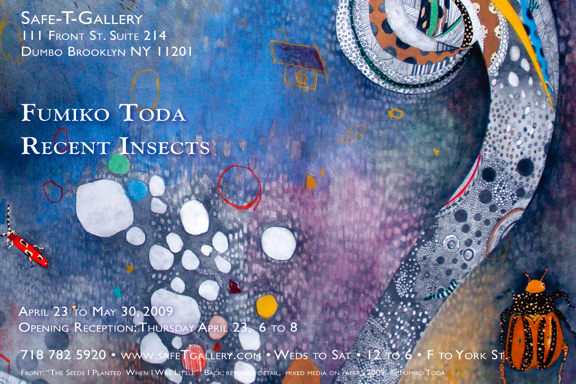 ニューヨーク在住のアーティスト、杜多史子(トダ フミコ)が、ニューヨークのDUMBO地区にあるSafe-T-Galleryにて個展を行なう。様々な種類のInsects(昆虫)たちが織りなす不思議な世界を、繊細で美しいタッチで描き出す。